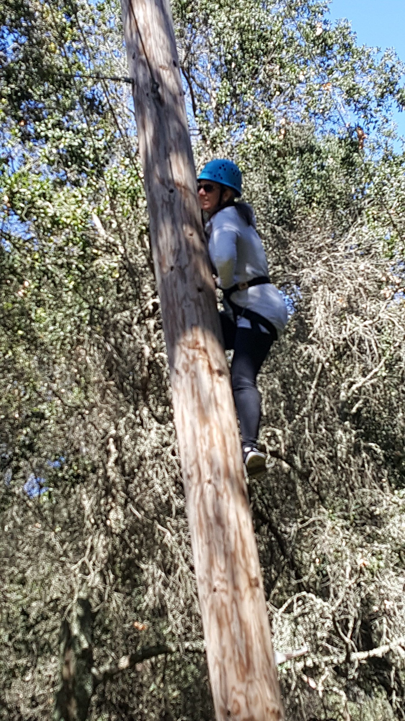 We started by playing a little ball game which was silly but quite fun. After later pondering I have decided that the game served as a quick distraction so you would forget the road you just travelled to get there. I am really starting to understand all this psychology stuff in life. I am a smart cookie! After our quick little change of focus game, we went to get safely harnessed up to the zip line. I was quite excited as I have always wanted to do a zip line and I found it as fun and invigorating as I expected to. I already am hoping for the next time that will maybe be a bit bigger and longer. After our zip lining fun came to an end we were moved to the next location. I sat down on a picnic bench and immediately assessed the situation. I looked high up and saw the ropes course. My mind instantly raced with a list of excuses of why I could not do this. I was searching deep to try to come up with a medical condition that would prevent me from joining. I realized I had nothing! Literally within the next 10-15 minutes I am harnessed up and climbing a telephone pole! Mind you I do not even like climbing a ladder, which I had already done successfully that day, I mean come on isn’t that enough! As I ascended I never looked down. I kept my eyes looking up at the next safe place to grab on to, which those little rungs were not very big either, I may add. Much sooner than I expected I made it to the top where I was to venture across the rope.